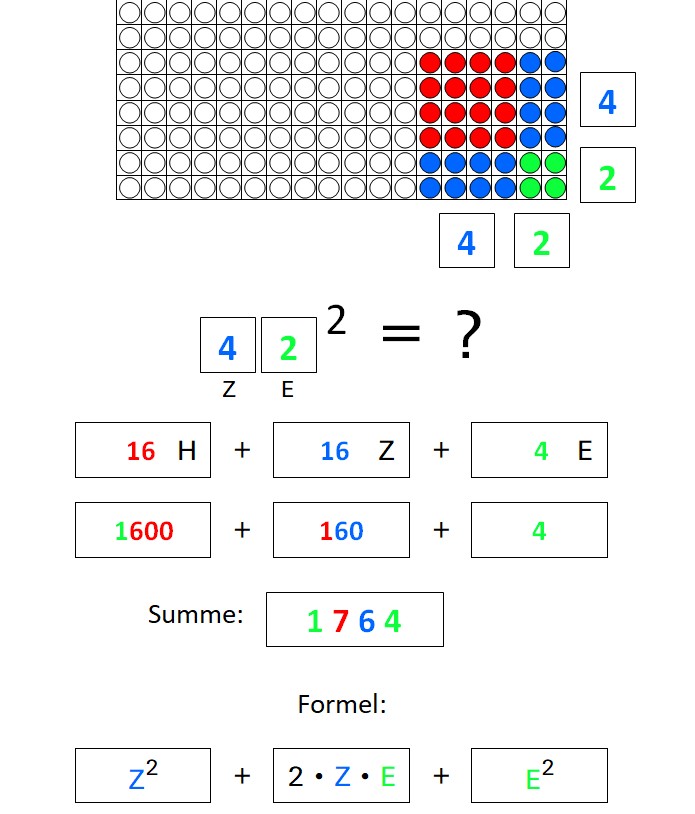 Es ist die Binomische Formel, aber dieser Begriff muss in der Grundschule nicht fallen. Interessant ist die Sache, wenn damit ein inneres Bild gebildet und gefestigt wird. Die Einsicht: „Logisch, so geht das!“